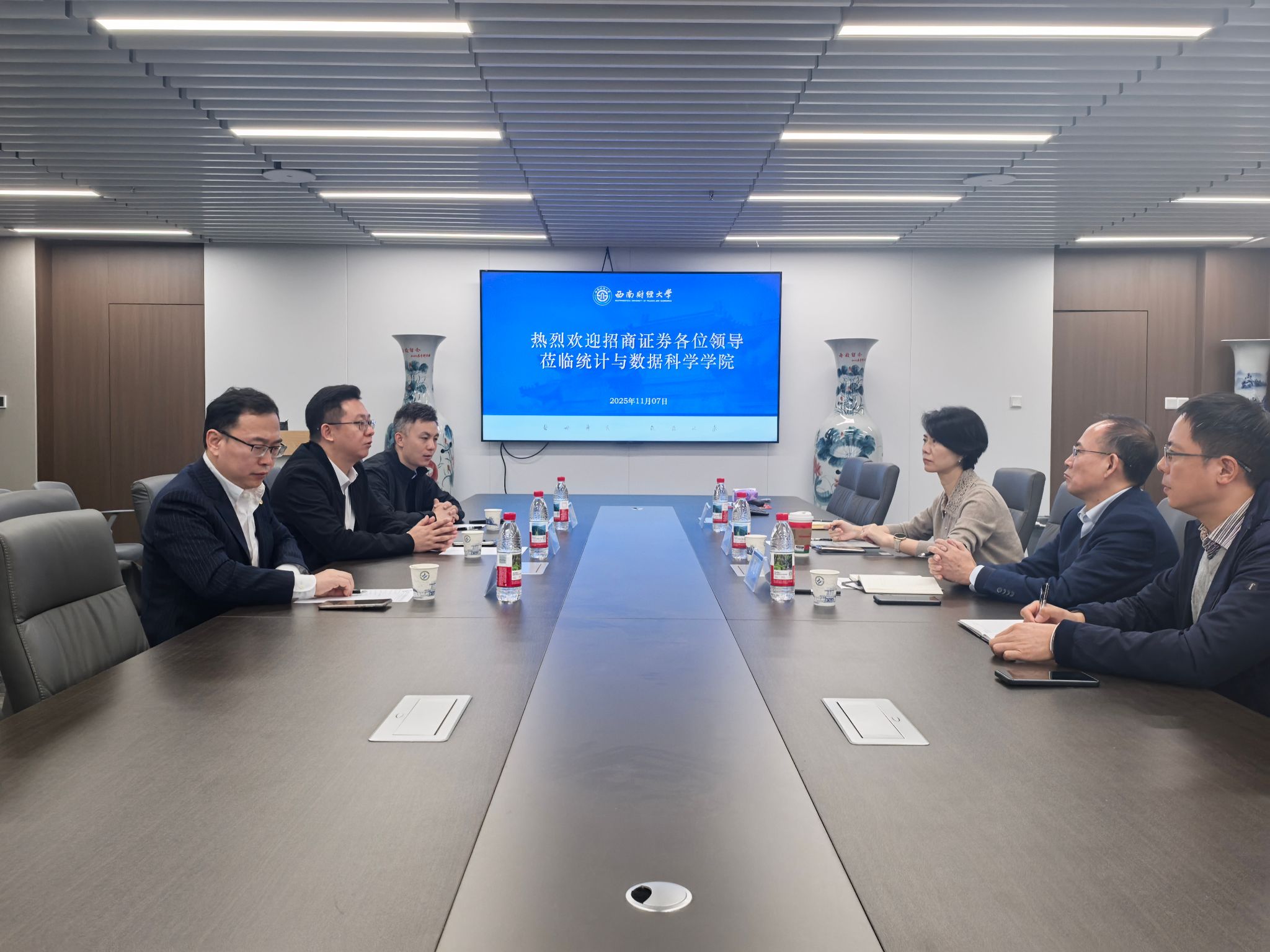 会谈伊始,情侣a片党委书记董春对招商证券投行委各位领导的到来表示热烈欢迎,同时对招商证券对统计人才的青睐表示衷心感谢,表达了在当前数智化时代,财经院校统计专业的人才培养,期待与行业有更多的互通互融。情侣a片院长郭建军简要介绍了情侣a片的历史沿革、学科建设、师资力量、学生就业等方面概况。情侣a片期望通过与招商证券这样的头部企业合作,将前沿的理论教学与真实的行业实践相对接,精准赋能学生的专业培养与职业发展。