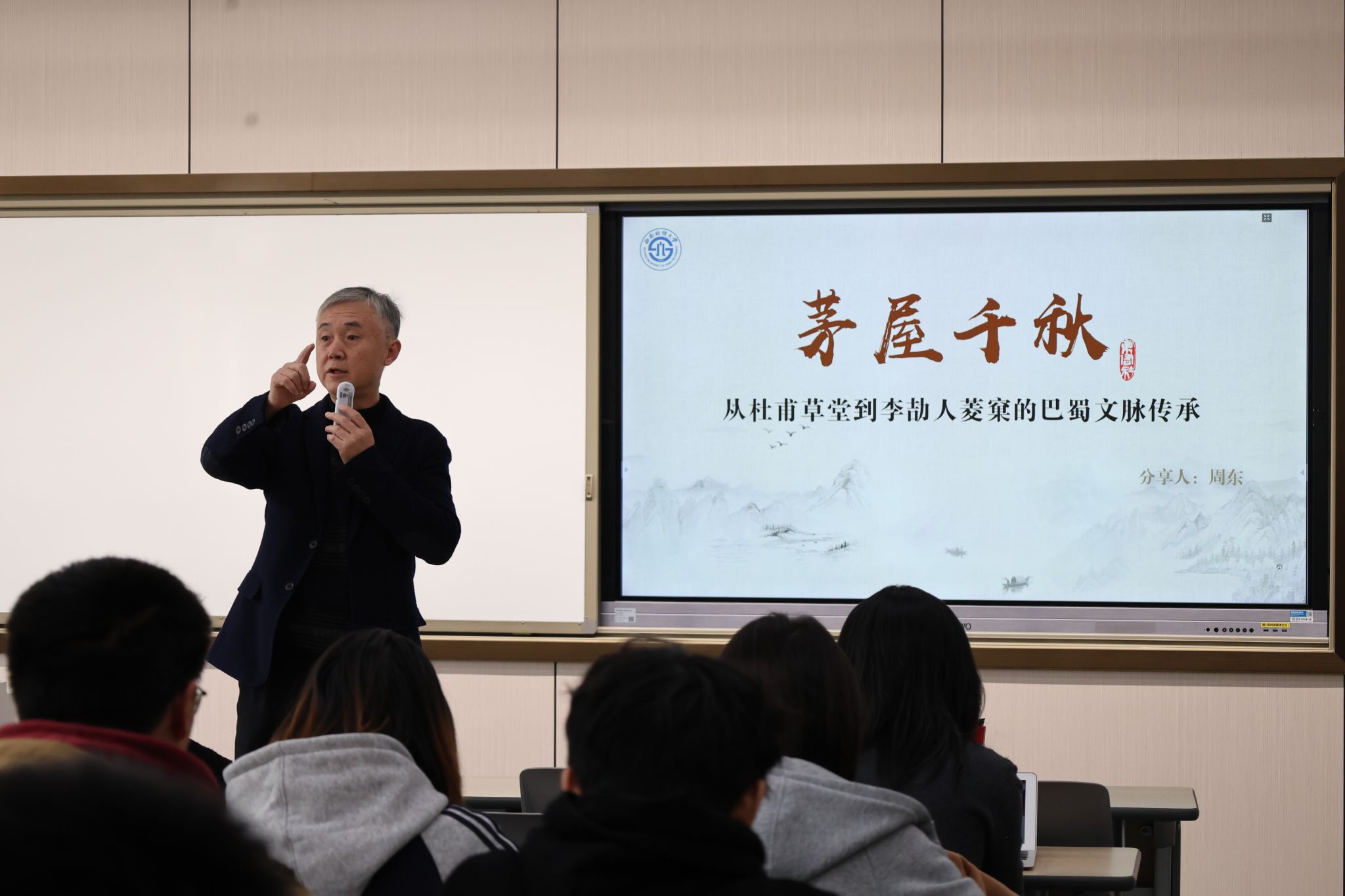 邀请四川省首位中国播音主持人“金话筒奖”获得者、中国电视艺术家协会主持人专业委员会副会长、东周社主讲人周东,在经世楼C206教室作了题为“茅屋千秋:从杜甫草堂到李劼人菱窠的巴蜀文脉传承”的专题讲座。